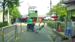 Nhân viên gác tàu nhanh trí khi xe máy tông văng barie tàu hỏa