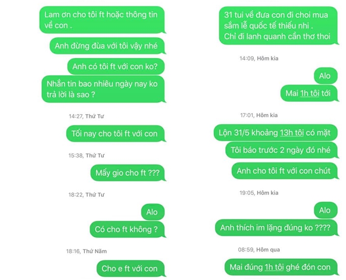 Nữ ca sĩ chia sẻ tin nhắn của mình xin phép chồng cũ đón con nhưng nhận lại là sự im lặng.Cô nhận ra mình đã ngây thơ khi nghĩ rằng sau ly hôn vẫn được gặp con thoải mái: "Mẹ cứ nghĩ hết tình còn nghĩa, ly hôn rồi con ở bên ba được ông bà nội chăm sóc và mẹ đi làm thường xuyên về với con. Mẹ lại càng ngây thơ khi nghĩ rằng họ sẽ thoải mái cho mẹ con mình ở bên nhau vào những ngày con nghỉ hè, hay những ngày lễ Tết... nhưng mẹ đã sai, sai trầm trọng. Mọi thứ đã đi quá xa, đã không như mẹ nghĩ, để rồi ngày hôm nay mẹ phải trả một cái giá quá đắt thế này và phải nghe những lời rêu rao từ họ là mẹ bỏ con. Phải chi hồi đó mẹ mạnh mẽ không nghe lời họ, cứ quyết ôm con cùng theo, lang bạt khổ thể xác một chút thôi. Nhưng hạnh phúc mẹ con bên nhau... chứ không phải như bây giờ. Mẹ đã phải chịu đựng 5 năm rồi Tin à".