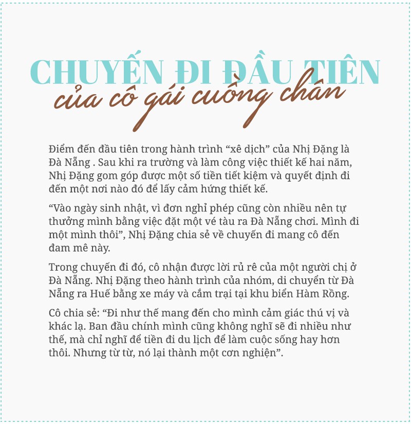 Nhị Đặng có cách định nghĩa hai từ "du lịch" thật dễ thương. Với cô, "mỗi lần đi là trải nghiệm như đang yêu ai đó vậy. Lên kế hoạch, xếp balo mà giống như lên đồ, makeup đi hẹn hò trong tâm thái của buổi hẹn đầu vừa hồi hộp vừa xen lẫn thú vị, phấn khích".