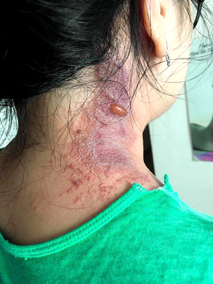 Chị N.T.H ngụ tại Thành phố Thủ Đức kể vùng da sau cổ bị ngứa, đỏ, rát…, chị nghi ngờ viêm da do tiếp xúc với kiến ba khoang (vì khu vực nhà chị ở có nhiều kiến ba khoang). Chị ra nhà thuốc gần nhà để mua thuốc thì được nhân viên nhà thuốc “chẩn đoán” là bị Zona và cho thuốc bôi, uống nhưng tình trạng không cải thiện mà diễn tiến nặng hơn, da phồng rộp nhiều kèm đau rát.