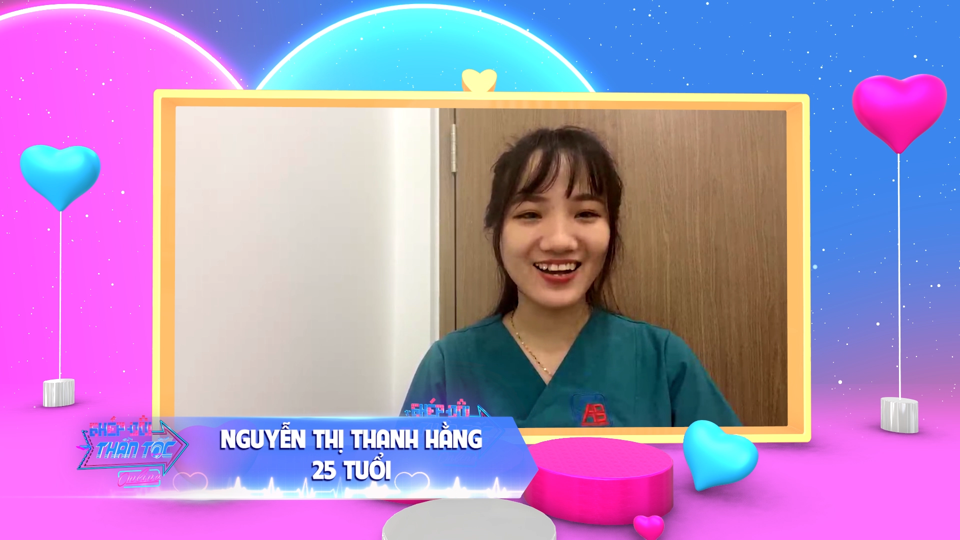 Tham gia chương trình, Thanh Hằng hi vọng có thể tìm được một nửa của mình qua sự hỗ trợ của bà mối Cát Tường. Cô gái chia sẻ hiện đang là nhân viên điều dưỡng tham gia công tác phòng chống dịch Covid-19 tại Bệnh viện An Bình (Quận 5, TP Hồ Chí Minh). Cô kể: “Bệnh viện em làm là nơi điều trị Covid-19, nên em tham gia vào tuyến đầu chống dịch. Em ở bệnh viện 2 tháng rồi chưa về nhà”.