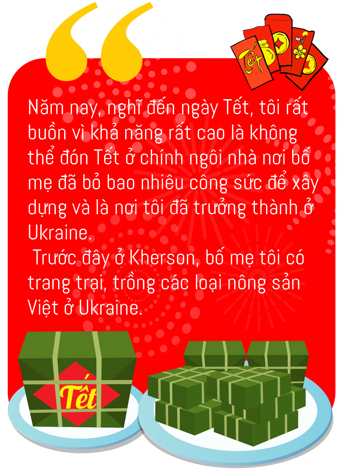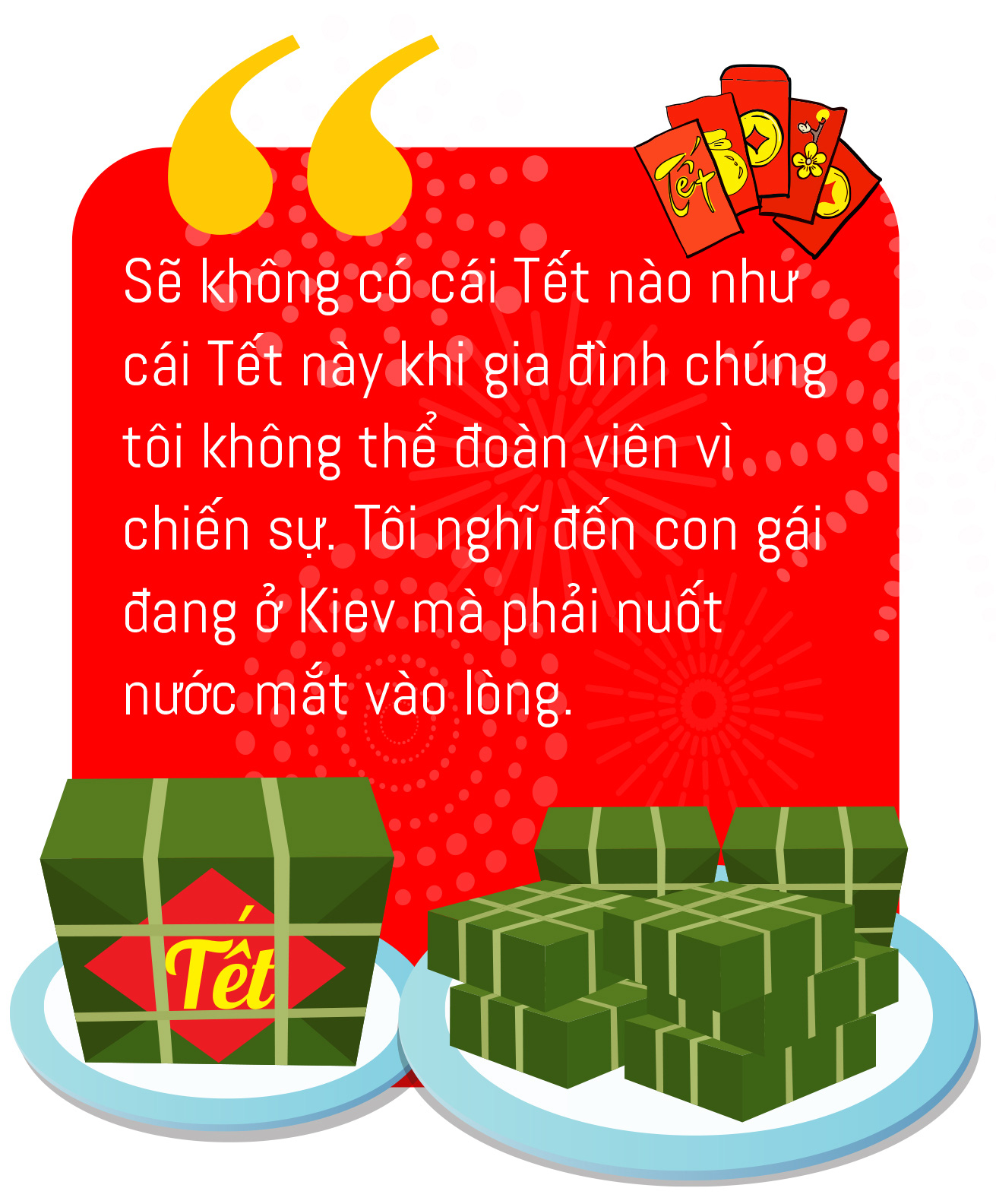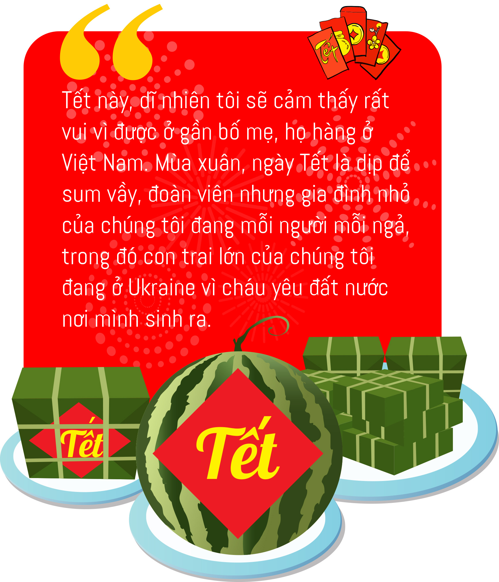 Con đang sống một mình ở nơi bom đạn nên vợ chồng chúng tôi không có tâm trạng nào mà nghĩ đến Tết, chỉ mong Ukraine mau bình yên để được yên tâm về con và được trở lại quê hương thứ hai của mình. Cũng như chúng tôi, con nói không có tâm trạng nghĩ về ngày Tết - Tết sẽ là ngày bom đạn ngừng rơi trên đất Ukraine.