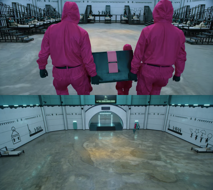 Bên cạnh đó, những trò chơi diễn ra trong Squid game còn được tiết lộ từ trước trên tường nhà của phòng sinh hoạt chung. Ngay từ đầu, tất cả manh mối đã ở đó, nhưng các nhân vật cũng như khán giả lại bị cuốn vào cuộc đấu chết chóc mà không đủ tinh ý để phát hiện ra.