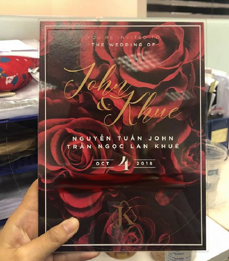 Thiệp cưới của Lan Khuê cùng chú rể doanh nhân John Tuấn Trần sử dụng chất liệu mica trong suốt. Trên nền của những bông hoa hồng đỏ thắm, font chữ đơn giản màu trắng, vàng đồng càng thêm nổi bật.