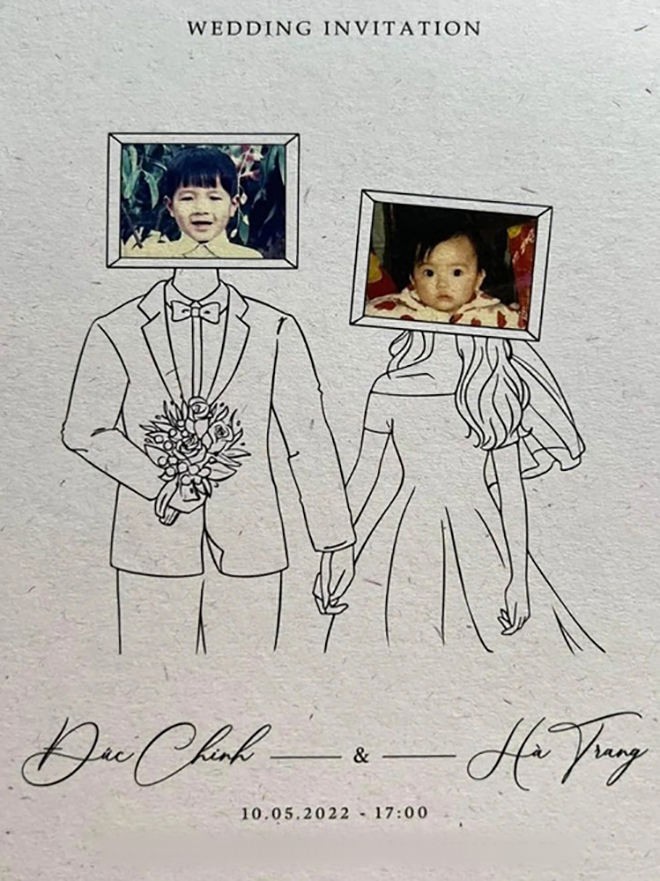 Đám cưới của cầu thủ Đức Chinh cùng Mai Hà Trang sẽ diễn ra vào ngày 10-5-2022. Theo đó, chiếc thiệp cưới được chính tay cô dâu vẽ hình, tạo điểm nhấn bằng hình ảnh hồi bé của cặp đôi. Điểm xuyết trên phông nền trắng xám thanh lịch, font chữ Calligraphy bay bổng càng làm tăng sự lãng mạn, tình cảm. Được biết, chi phí cho mỗi tấm thiệp dao động từ 25.000 - 30.000 đồng, tùy vào số lượng in.