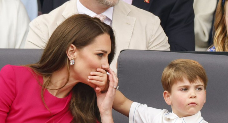 Một khoảnh khắc vị hoàng tử bé lấy tay che miệng mẹ mình bị "bắt thóp" khi Kate đang định nói chuyện với Louis.