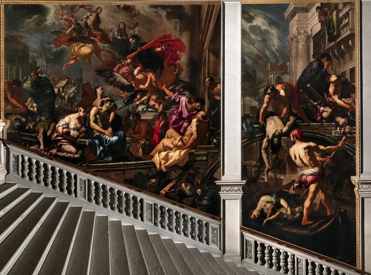 Khi bệnh dịch càn quét khắp nơi, các danh họa vẫn vẽ lên canvas những tác phẩm đầy sống động, mà hàng trăm năm sau, hậu thế xem tranh vẫn có thể thấy từng cơn hấp hối và nghe từng lời nguyện cầu của bao người trong những giai đoạn kinh hoàng nhất của lịch sử nhân loại. Các thành phố châu Âu đã nhiều lần phải hứng chịu những trận dịch bệnh làm chết 10-50% dân số. Và rất nhiều tên tuổi của nền hội họa thế giới bị những cơn dịch bệnh ám ảnh. Nhưng những bức tranh vẽ giữa đại dịch đầy tài hoa của họ không chỉ tái hiện một cách sống động cảnh hoảng loạn, chết chóc, mà giữa tuyệt vọng và đau đớn, các tác phẩm ấy vẫn cho thấy đức tin và tình yêu của con người. "Pietà", sơn dầu trên canvas, kích thước 389×351cm, do Titian vẽ vào khoảng năm 1575-1576 Lòng thương (khoảng năm 1575-1576)Trong bức Pietà (Lòng thương), Titian (1488/1490-1576) đã đưa chính mình vào hình ảnh một ông già đang phủ phục trước Đức Mẹ và thi thể Chúa Jesus. Ở góc dưới bên phải của bức tranh, họa sĩ khéo léo vẽ thêm một khung tranh nguyện, một vật trang trí thường thấy trong các nhà thờ đương thời. Chi tiết này có hình bóng của cả Titian và con trai Orazio đang quỳ. Nó nhấn mạnh thông điệp đơn giản mà họa sĩ truyền tải trong toàn bộ tác phẩm: Để sống sót qua trận dịch, một ông già đã khấn nguyện cho bản thân và con trai. Vào cái thời người ta không biết bệnh dịch đến từ đâu và làm thế nào để chữa trị, việc mà tất cả - từ những người nông dân bần hàn đến những vị văn sĩ và quý tộc - có thể làm là cầu nguyện. Nhưng điều đó không cứu được Titian. Ông và con trai đều chết năm 1576, trong một trận dịch kinh hoàng tàn phá thành Venice bằng một loại bệnh mà sau này hậu thế mới xác định được là dịch hạch. "The seven works of mercy", sơn dầu trên canvas, kích thước 390x260cm, Caravaggio vẽ năm 1607.Bảy hành động nhân từ (năm 1607)Các nhà thờ Công giáo thường treo bảy bức tranh chỉ ra các việc mà tín đồ nên lưu tâm thực hiện để giúp đỡ kẻ khó. Nhưng nhà thờ Pio Monte della Misericordia ở Napoli chỉ treo có một bức. Đó là một tác phẩm do Caravaggio (1571-1610) thực hiện, thường được biết đến với tên The seven works of mercy, vẽ bảy hành động với sự sắp đặt khéo léo cho thấy rõ những gì mà đương thời người ta thường được nhắc nhở phải làm cho người khác: cho người đói ăn, cho người vô gia cư chỗ nương náu, cho người không áo quần thứ để mặc, cho người khác nước uống, thăm nom tù nhân, chăm sóc người ốm, và chôn cất người chết. Vẽ giữa thời tử khí bốc lên khắp nơi ở Napoli, Caravaggio tinh tế che đi cảnh thương tâm trong lời dạy thứ bảy, chỉ để lại một chi tiết nhỏ thể hiện sự chết chóc: một đôi bàn chân lộ ra dưới lớp vải liệm, khi hai người đàn ông đến đưa thi thể đi chôn. "Saint Sebastian", sơn dầu trên canvas, kích thước 101x117cm, Gerrit van Honthorst vẽ khoảng năm 1623.Thánh Sebastian (khoảng năm 1623)Vì theo Thiên Chúa giáo, người lính La Mã tên là Sebastian bị tra tấn bằng bắn tên ở tầm gần. Nhưng cực hình không giết chết được Sebastian, anh vượt qua được cơn nguy kịch và bình phục một cách thần kỳ, rồi từ đó được tôn là một vị thánh bảo vệ con người trước những cơn dịch bệnh. Gerrit van Honthorst (1592-1656) đã vẽ Thánh Sebastian (Saint Sebastian) khi quê nhà Utrecht của ông ở Hà Lan bị bệnh dịch hạch tấn công vào những năm 1620. Chỗ những mũi tên đâm vào Sebastian chính là những chỗ mà cơ thể con người thường nổi những hạch viêm khi nhiễm bệnh dịch hạch. Sắc da trắng xanh của nhân vật nổi bật giữa một bối cảnh tối sẫm và những chi tiết của màn hành hình đầy dã man được mô tả sống động là những gì Honthorst ảnh hưởng từ bậc thầy Caravaggio. Nhưng ẩn trong sự mô tả nỗi thống khổ của vị thánh là một thông điệp đầy khích lệ rằng hãy như Sebastian, hãy sống sót thần kỳ qua cơn nguy nan. Bức tranh "L'Umana Fragilita" (Sự yếu hèn của loài người) sơn dầu trên canvas, kích thước 197x131cm, Salvator Rosa vẽ năm 1656.Sự yếu hèn của loài người (1656)Người ta cho rằng ít nhất một nửa số người ở thành phố Napoli - khoảng hơn 200.000 người - đã chết vì bệnh dịch hạch vào năm 1656. Được vẽ từ tâm dịch, bức Human Frailty (Sự yếu hèn của loài người) của Salvator Rosa (1615-1673) ban đầu thu hút người xem vào hình ảnh lấp lánh ánh sáng của ba đứa trẻ kháu khỉnh chơi đùa bên một người phụ nữ xinh đẹp, nhưng rồi lại mang đến sự sợ hãi với hình ảnh Thần chết hiện ra từ bóng tối trong hình dạng một bộ xương đen vươn đôi cánh xơ xác lông đầy gớm ghiếc ra bao trùm lên mọi thứ. Sự tàn nhẫn của bệnh dịch được thể hiện lên đến đỉnh điểm trong một chi tiết đầy nhức nhối: đứa bé sơ sinh viết bản thỏa thuận trước Thần chết thừa nhận rằng sự tồn tại của kiếp người là khốn khổ và ng