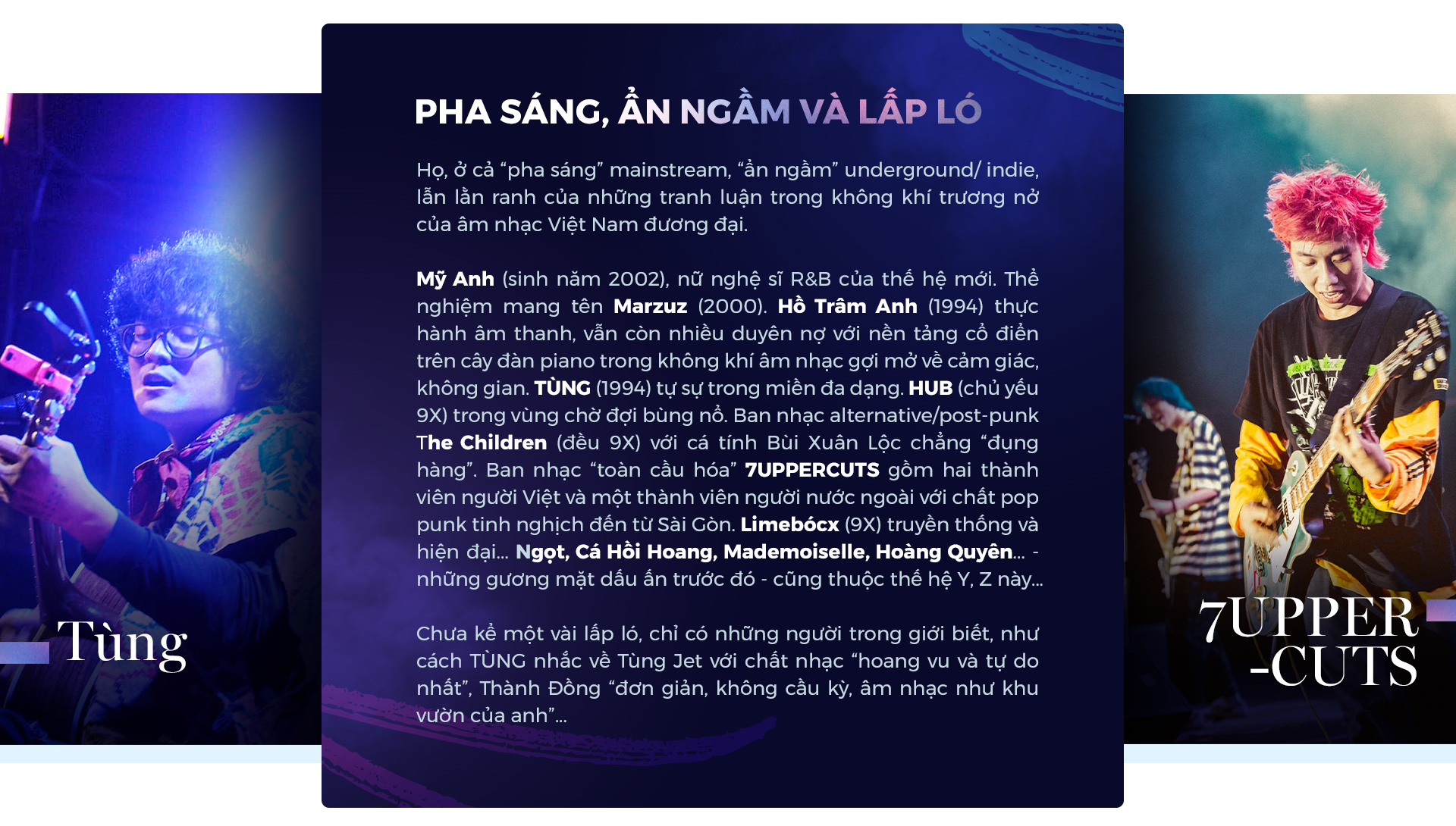 Với thế hệ này, âm nhạc trở thành một thứ ngôn ngữ, một phương cách đặc biệt nhất để những người trẻ - dù dị biệt hay đại chúng, dù ở trong tối hay ngoài sáng - “giải mã” chính mình, đồng thời bước qua những giới hạn và cả không - thời gian.