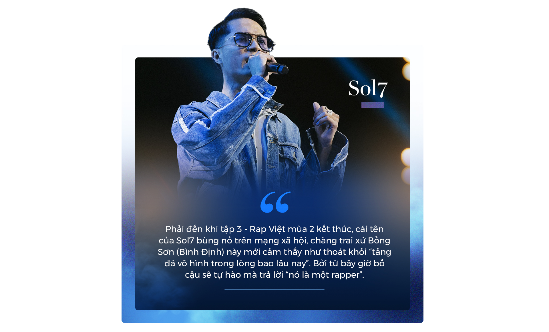 Phải đến khi tập 3 - Rap Việt mùa 2 kết thúc, cái tên của Sol7 bùng nổ trên mạng xã hội, chàng trai xứ Bồng Sơn (Bình Định) này mới cảm thấy như thoát khỏi “tảng đá vô hình trong lòng bao lâu nay”. Bởi từ bây giờ bố cậu sẽ tự hào mà trả lời “nó là một rapper”.