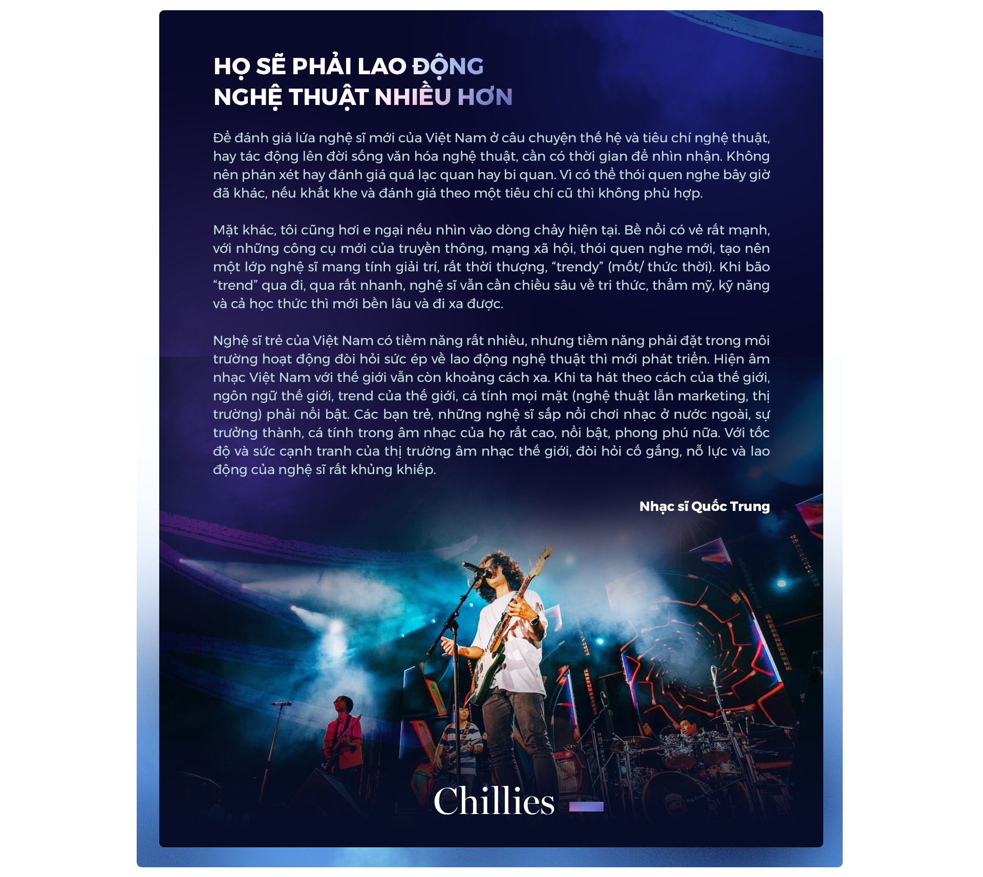 Và khi những người lớn nói với nhau nhạc Việt đang “đứt gãy” thế hệ, thậm chí khủng hoảng thế hệ, có một thế hệ cuối gen Y tới gen Z (được sinh ra từ những năm 1990 tới cuối những năm 2000) đã kịp lớn, bắt đầu xác lập “tiếng nói” của mình. Dẫu được chào đón hay không, dẫu sự tạo dạng còn khiến người ta e dè và nghi ngại, ở đâu đó, ở khía cạnh nào đó, có một sự thật khó phủ nhận: không ai ngăn được một làn sóng mới đang đến. Từ phía những người tạo xu hướng lẫn khán giả của họ.