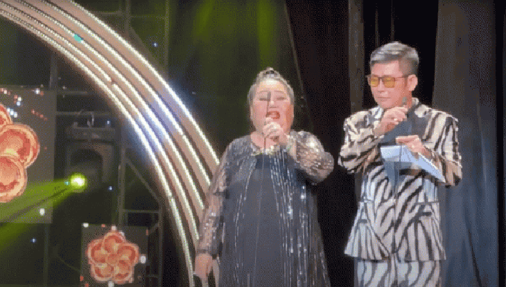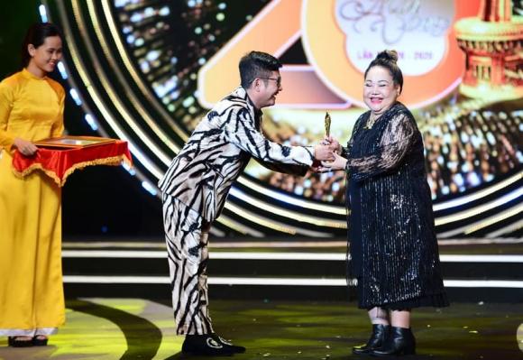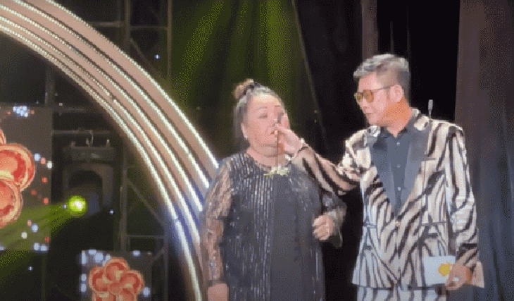 NSND Ngọc Giàu lên nhận giải thay Huỳnh Lập, gặp phải chiếc micro làm khó mình.