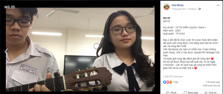 Trải qua gần 1 tháng tổ chức cuộc thi cover, tối 14-6, Hòa Minzy chính thức công bố kết quả nhất, nhì, ba trong top 15 bản cover được chọn, trên trang cá nhân.