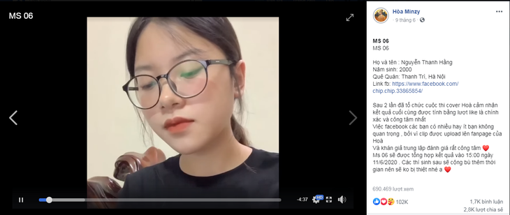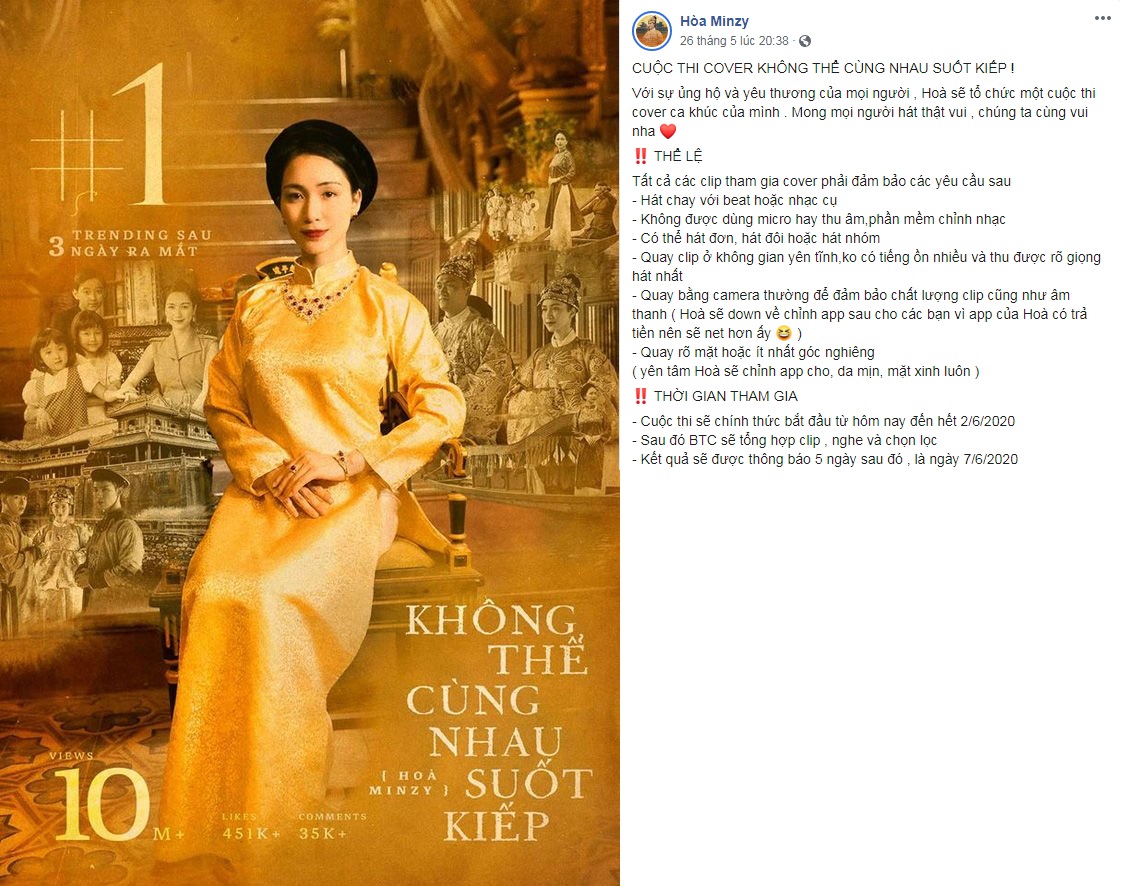 Sau thời gian gây bão trên mạng xã hội với bản balad Không thể cùng nhau suốt kiếp, tối 26-5, ca sĩ Hòa Minzy đã chính thức thông báo trên trang cá nhân về việc tổ chức một cuộc thi cover ca khúc đình đám của mình.