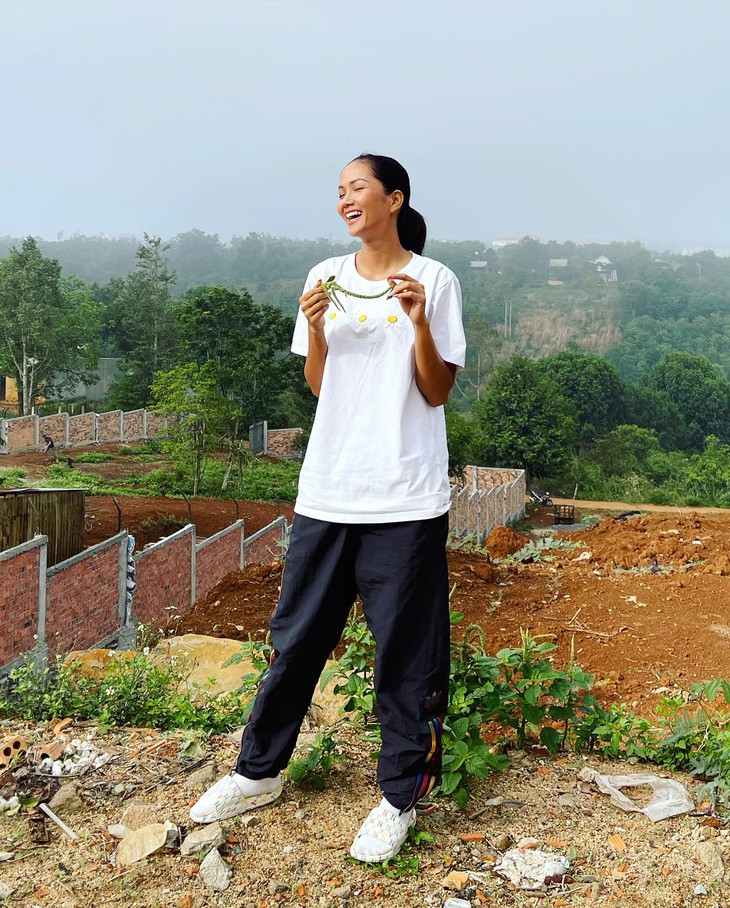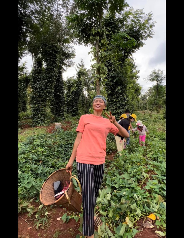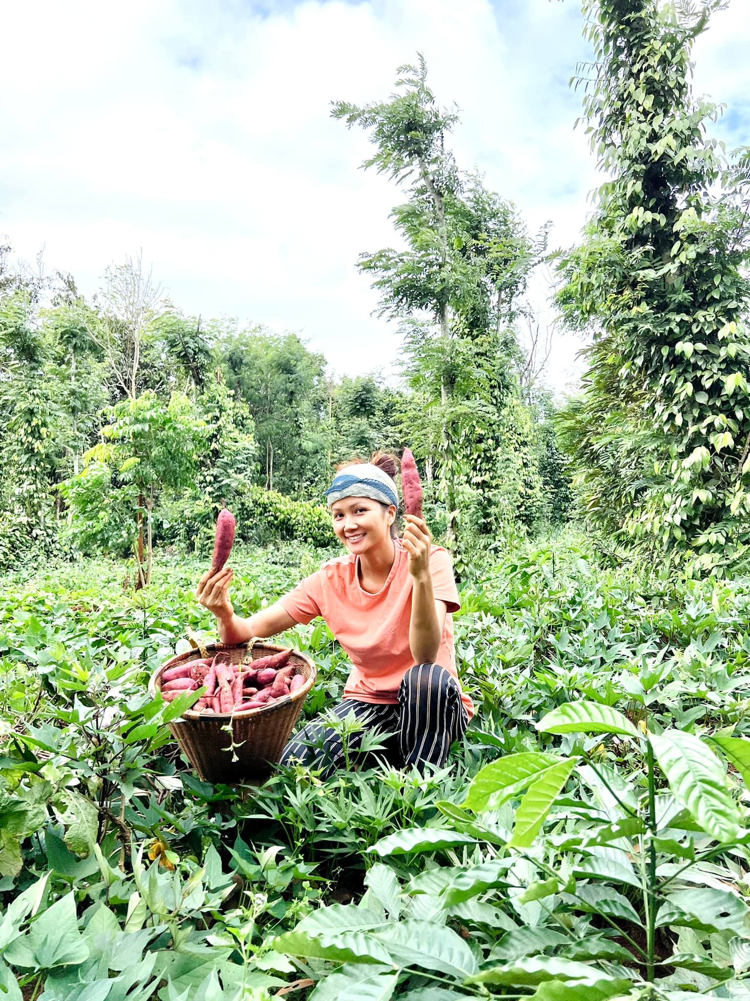 Trong vlog về cuộc sống đời thường mới đăng tải, H'Hen Niê lại làm khán giả bất ngờ khi hoá thân thành thôn nữ mộc mạc, chân quê khi tranh thủ phụ giúp gia đình thu hoạch khoai lang trong chuyến công tác ở quê nhà.