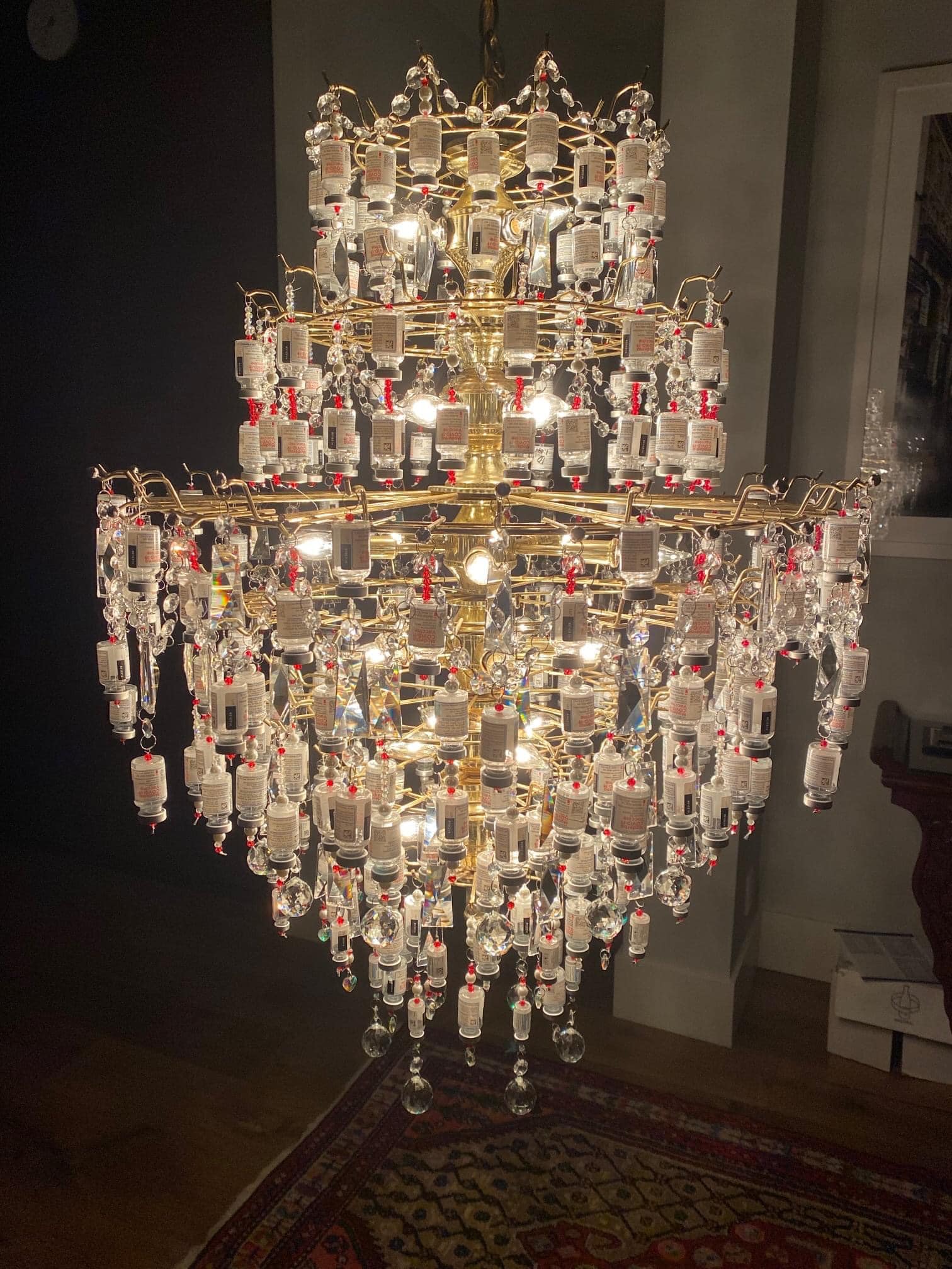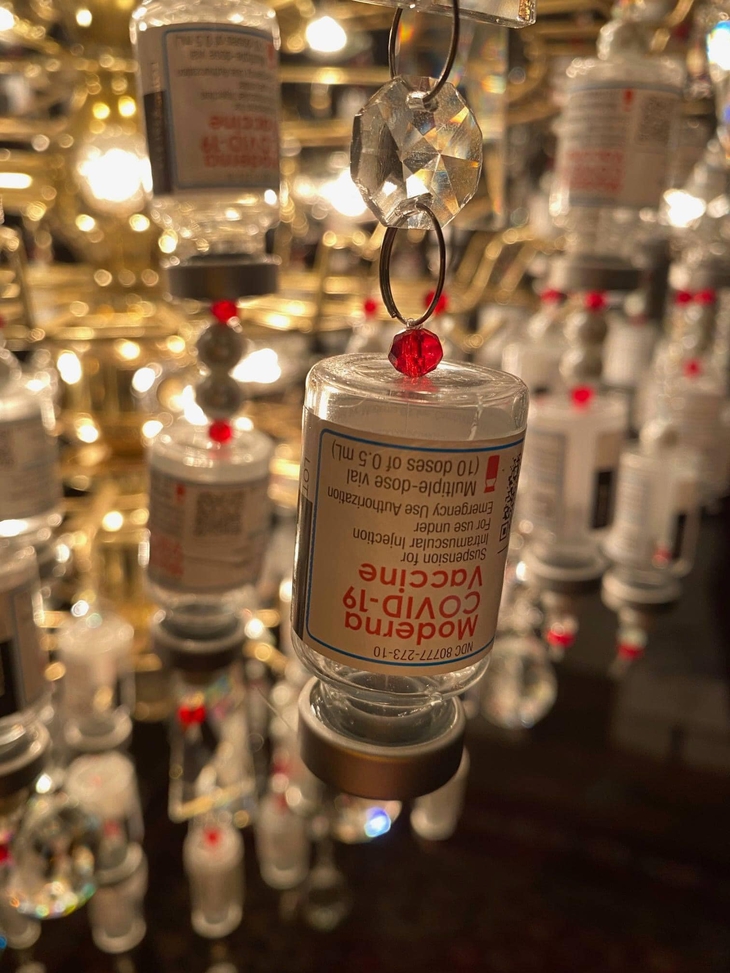 Laura Weiss (Colorado, Mỹ) là một y tác làm việc tại Trung tâm Y tế công cộng quận Boulder. Cô đã dùng hàng trăm lọ vaccine Covid rỗng để tạo thành đèn chùm một cách sáng tạo và độc đáo.