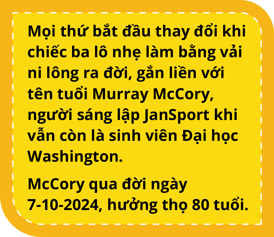 McCory đã lấy một sản phẩm có sẵn - loại ba lô nhẹ, không khung, dùng cho những chuyến leo núi ngắn - rồi thêm đáy gia cố, khóa kéo ni lông và vài chỉnh sửa khác để biến nó thành vật dụng thân thiện với sinh viên.