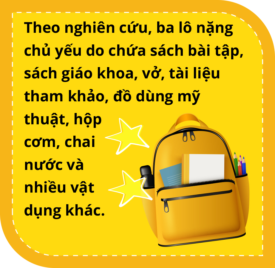 Thêm bình nước và đồ dùng học tập lại càng nặng hơn. Tôi lo con có thể vấp ngã trên cầu thang vì chiếc ba lô quá nặng" - người mẹ than. Yada ước tính chiếc ba lô của con nặng khoảng 3 kg, vượt quá khuyến nghị 10% trọng lượng cơ thể.