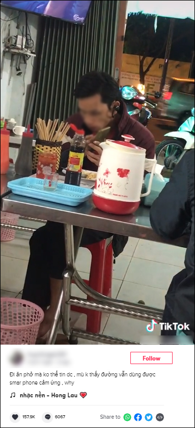 Đoạn clip thu hút lượng lớn người dùng TikTok khi nhanh chóng đạt được 3,2 triệu lượt xem cùng hơn 6.000 bình luận. (Ảnh chụp màn hình)Như mới đây, một cô gái đã quay lại đoạn clip về anh chàng khiếm thị đang sử dụng smartphone tại quán ăn với dòng bình luận: "Đi ăn phở mà không tin được. Mù không thấy đường vẫn dùng được smartphone cảm ứng. Why? (Tại sao?)".