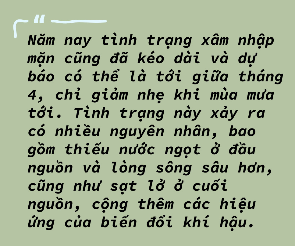 Ghi nhận vào năm 2019 chẳng hạn, cho thấy từ giữa tháng 11 tới tháng 1-2020, nước mặn đã vào sâu hơn tới 30-40km so với mức trung bình hằng năm của mùa khô.