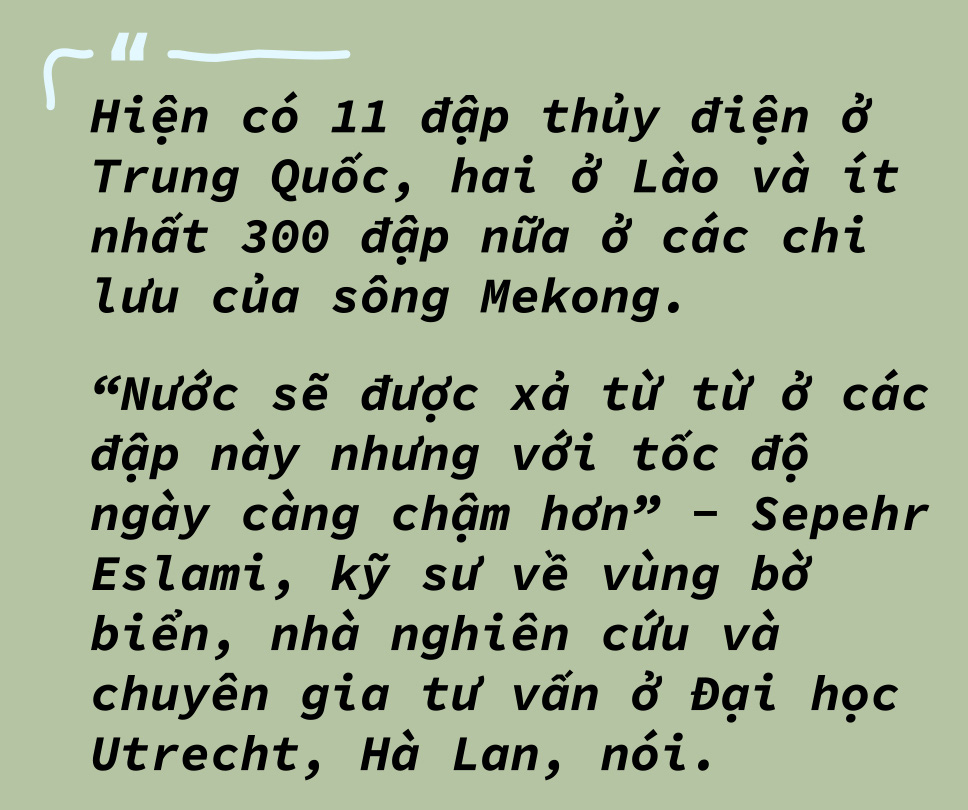 Nhưng "nếu các đập nước không được xây lên và hoạt động khai thác cát là hạn chế, đây đã không phải vấn đề lớn - Sepehr nói - ... Quy mô [khai thác cát] không chỉ là khổng lồ ở Việt Nam, mà cả ở Campuchia. Chúng ta đang nói tới khối lượng... 50-100 triệu tấn mỗi năm".