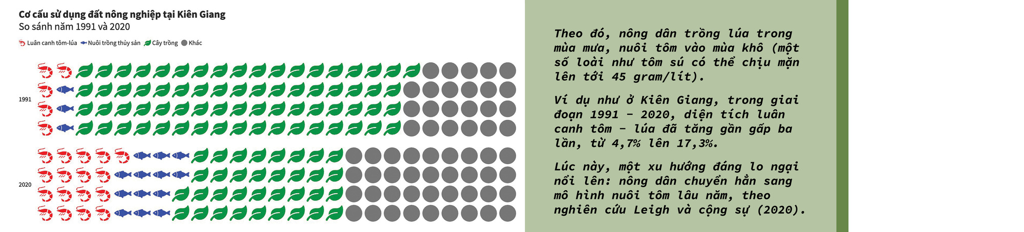 Năm 2020, nông dân trồng lúa ở các tỉnh bị xâm nhập mặn đã bị mất ít nhất 30% sản lượng thu hoạch do thiếu nước ngọt. Sau thảm họa này, nhiều nông dân đã chuyển sang mô hình luân canh tôm - lúa.