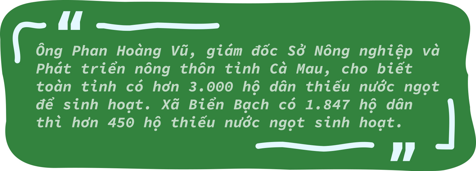 Ấp Thanh Tùng có nhóm 16 hộ sống biệt lập ở khu đất nuôi tôm nên các ghe nước không tiện đường đi. Cứ chục ngày, dân trong xóm phải đi rảo các kênh lớn, gặp ghe chở nước thì kéo về xóm để mỗi nhà đổi vài ba khối.