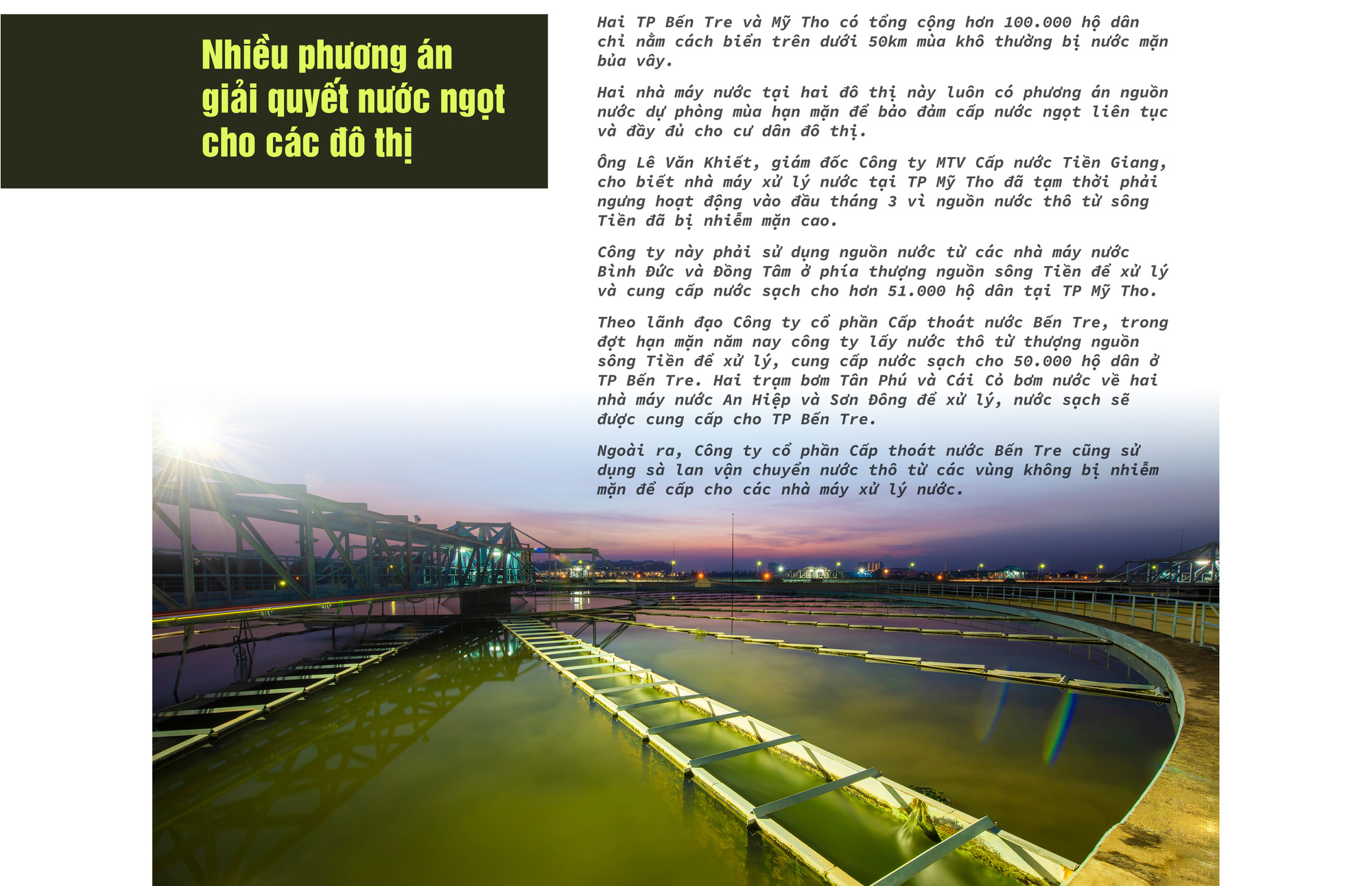 Hỏi chuyện thiếu nước mùa hạn mặn, bà Nguyễn Thị Phượng (51 tuổi, ở Ba Tri, Bến Tre) chỉ tay về dãy ống xi măng bên hông nhà, nói: "Nhìn đây là biết chúng tôi đã sống sót qua bao mùa hạn mặn, thiếu nước ra sao".