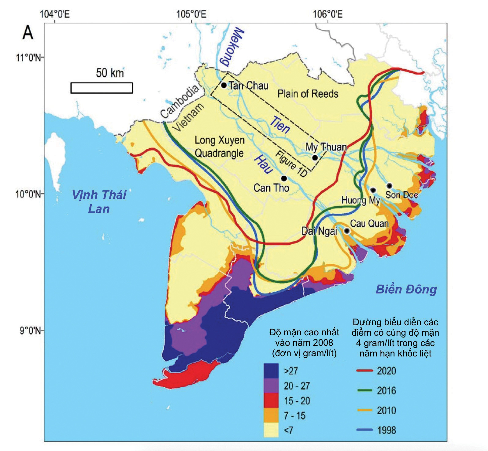 Hình 1: Hồ Hữu Lộc và cộng sự, "Intensifying saline water intrusion and drought in the Mekong Delta: From physical evidence to policy outlooks", 2021. (Bản vẽ đã được lược bớt một vài chi tiết)