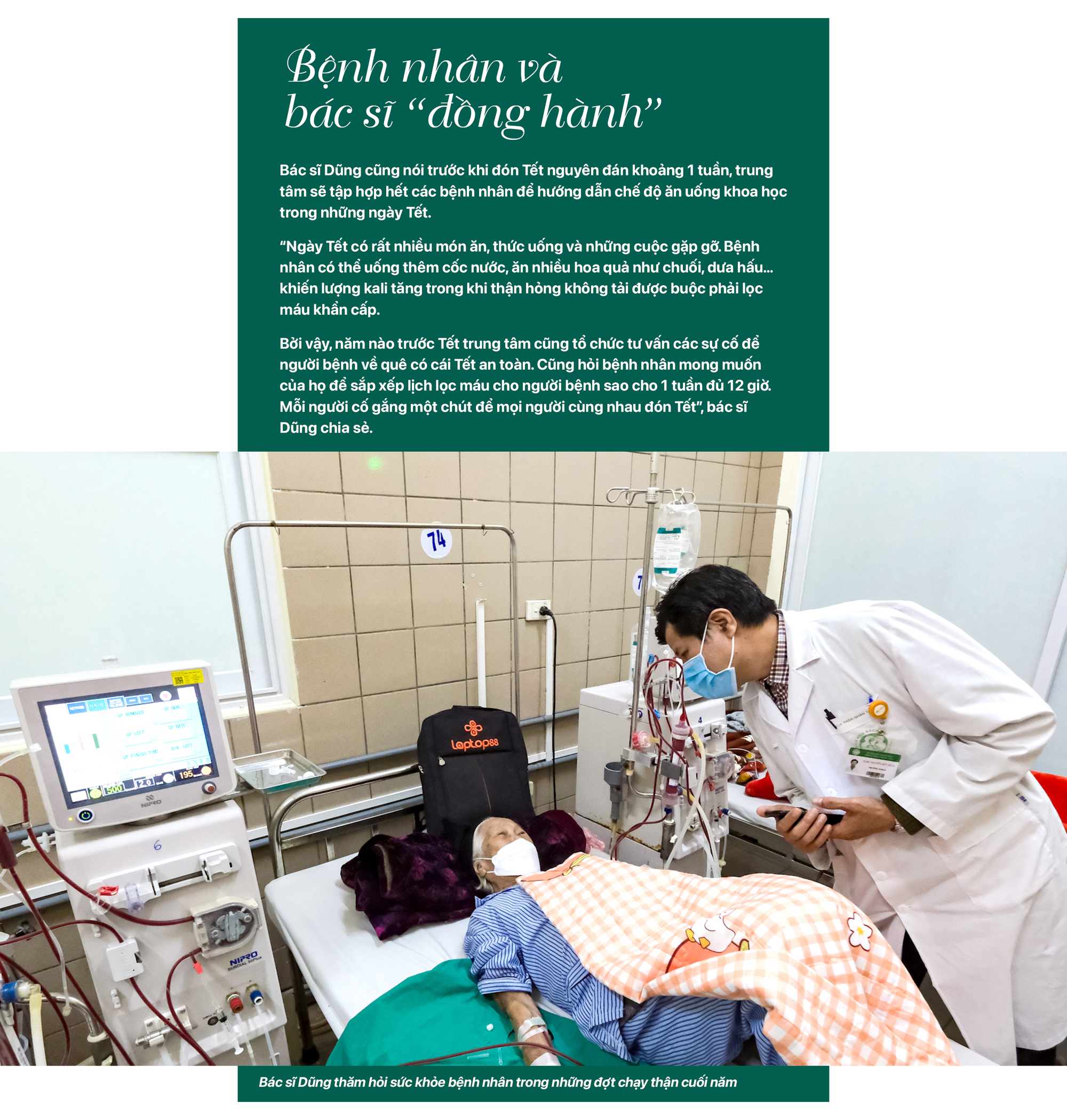 Bác sĩ Dũng cho hay bệnh nhân chạy thận nhân tạo tuân thủ lịch một cách đều đặn. Một tuần, họ vào trung tâm ba lần để chạy thận (thứ ba, năm, bảy hoặc hai, tư, sáu), việc chạy thận được chia theo từng ca. Vì để bệnh nhân không phải bỏ ngày lọc máu nào, có năm y bác sĩ phải làm việc cả mùng 1 Tết. Năm nay, ca chạy thận cuối năm sẽ kết thúc vào trưa ngày 30, y bác sĩ có... một ngày rưỡi để ăn Tết.