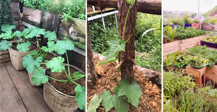 Trong khu vườn nho nhỏ của mình, anh trồng những loại rau như kale xanh, cải cầu vồng, xà lách, mồng tơi giàn, hẹ, ớt, dưa peption cùng 10 loại rau thơm khác nhau...