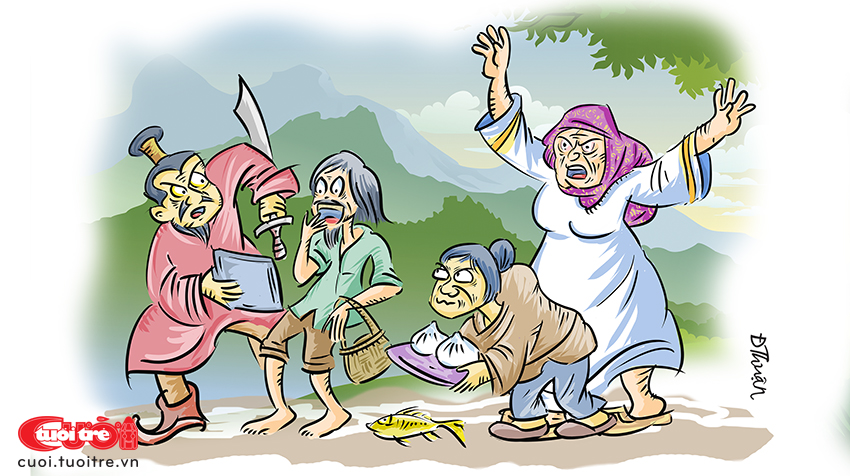 Đang vò vò hai cái bánh bao tính ăn thì Lưu Bị bỗng nghe tiếng khóc. "Khổ tui quá! Khổ thân tui quá mà!". Nhìn kỹ Lưu Bị mới biết đó là ông lão đánh cá năm nay đã ngoài 70 tuổi. Ông lão kể khổ:" Tui đánh được con cá vàng, bà nhà bắt tui đi đổi cái máng heo mới".