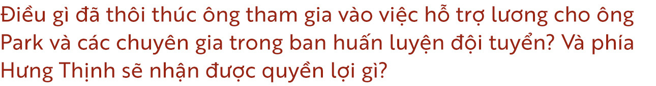 Và với việc hỗ trợ này, Tập đoàn Hưng Thịnh mong muốn góp phần hỗ trợ, chia sẻ gánh nặng với ngân sách nhà nước và VFF trong việc đảm bảo phúc lợi tốt hơn cho ông Park cũng như các chuyên gia, từ đó góp phần vào việc phát triển nền bóng đá nước nhà.