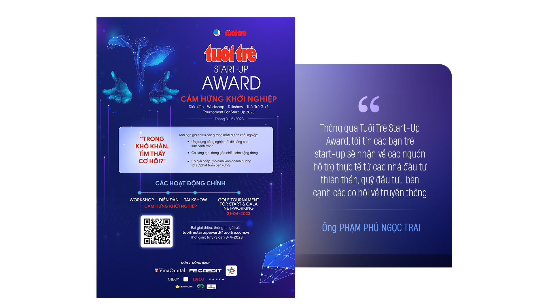 Tôi nhận được lời mời nhiều sự kiện liên quan đến khởi nghiệp, nhưng tôi chọn đồng hành cùng Tuổi Trẻ vì tin mình sẽ góp phần tạo được nhiều giá trị hơn, hiệu quả hơn. Với thế mạnh một cơ quan truyền thông lớn, Tuổi Trẻ sẽ lan tỏa được nhiều câu chuyện, bài học để giới start-up tham khảo, phòng tránh lẫn hoàn thiện. Tôi cho rằng nên truyền thông về chương trình sớm và dài hơn để nhiều bạn trẻ biết đến hơn nữa.
