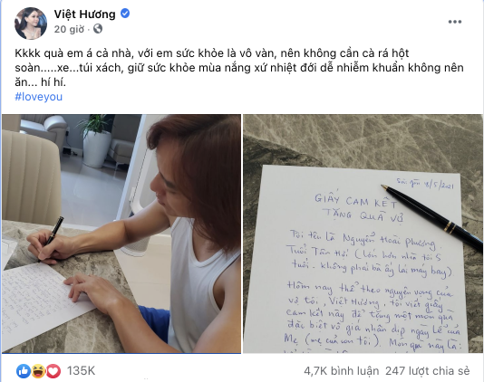 Sau đó, ông xã Việt Hương vào đề: "Hôm nay, thể theo nguyện vọng của vợ tôi, Việt Hương, tôi viết giấy cam kết này để tặng một món quà đặc biệt vô giá nhân dịp lễ của Mẹ (mẹ của con tôi). Món quà này là kể từ ngày hôm nay 18-5-2021 tôi sẽ vĩnh viễn không bao giờ ăn một món ăn tôi ưa thích: tiết canh các loại (vịt, dê, heo…). Món quà đơn sơ nhưng là một hi sinh lớn lao của tôi tặng vợ. Happy mother’s day bà xã. Hoài Phương".