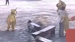 Con khỉ trên cao nhảy xuống chiếc ô tô đậu ở lề đường và làm vỡ toang cửa sổ trời.