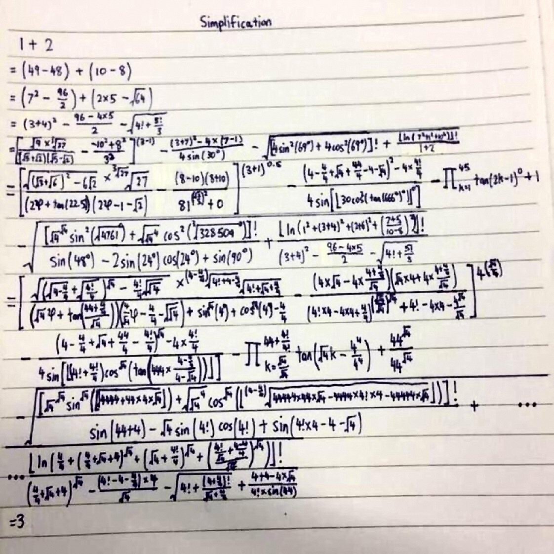 Đáp án vẫn là số 3 nhưng cách thực hiện đã được "biến tấu" vô cùng cồng kềnh, phức tạp theo hướng nghiên cứu toán học.Mới đầu nhìn vào, ai nấy đều thắc mắc tại sao một phép tính đơn giản lại cần phức tạp hóa đến vậy. Thế nhưng theo lý giải của những người nghiên cứu toán học, đây là một trong những cách chứng minh để một phép tính có kết quả sau cùng. Vì vậy kỹ năng phân tích và ứng dụng các công thức để giải ra một bài toán là điều chẳng kém phần quan trọng.