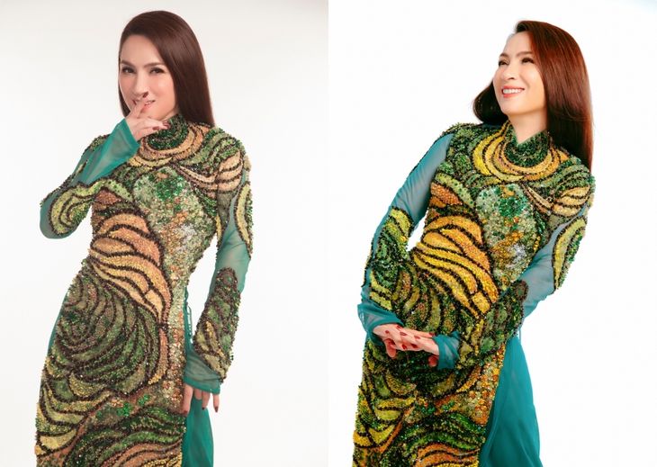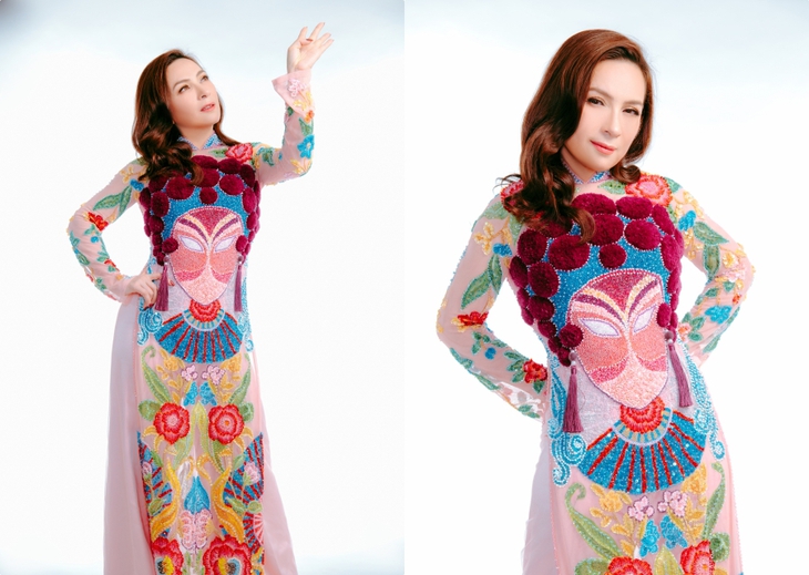 Nhan sắc Phi Nhung ở tuổi 49Trong bộ ảnh, Phi Nhung diện các thiết kế áo dài truyền thông có hoạ tiết trống đồng chim lạc, bản đồ Việt Nam, ruộng bậc thang... được đính kết vô cùng đặc biệt. Vì được mời làm mẫu cho những thiết kế độc nhất vô nhị này nên Phi Nhung lên kế hoạch giảm cân để có hình ảnh đẹp hơn.