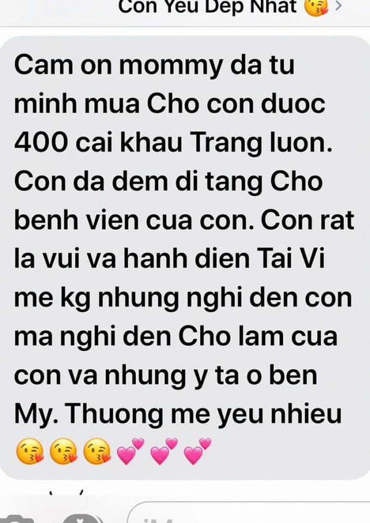 Không chỉ tặng khẩu trang, Phi Nhung còn gửi đến con lời nhắn thật xúc động: "Mẹ chỉ làm cho con được như vậy... Vì kỷ niệm một năm làm của con. Mẹ thật sự thấy con cười. Mẹ yêu con nhiều lắm. Cố gắng con nhé. Mẹ rất khỏe, con an tâm nha. Mẹ chỉ ở nhà để con khỏi lo. An tâm công chúa của mẹ.