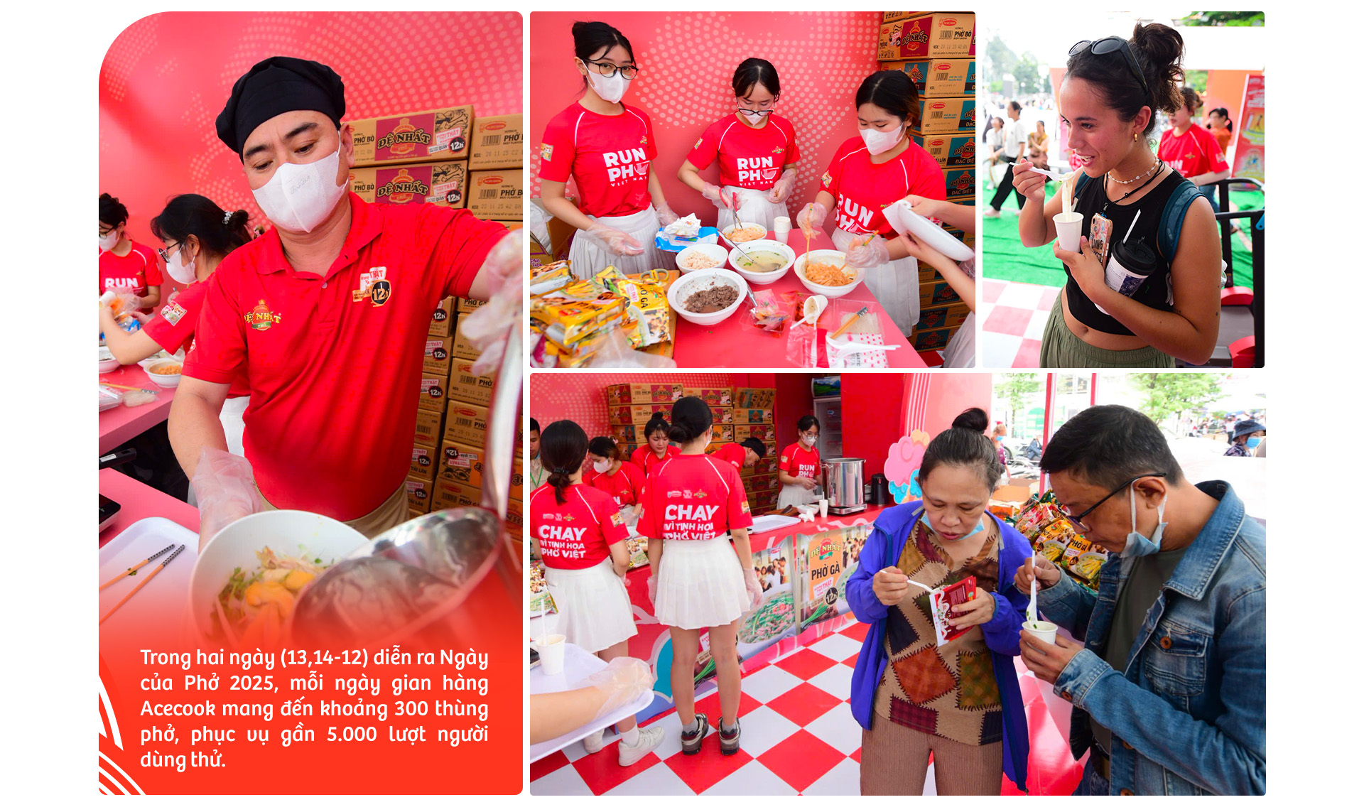 Hơn 300 thùng phở gói, phục vụ gần 5.000 lượt người dùng thử mỗi ngày tại gian hàng Acecook trong Ngày của Phở năm 2025.