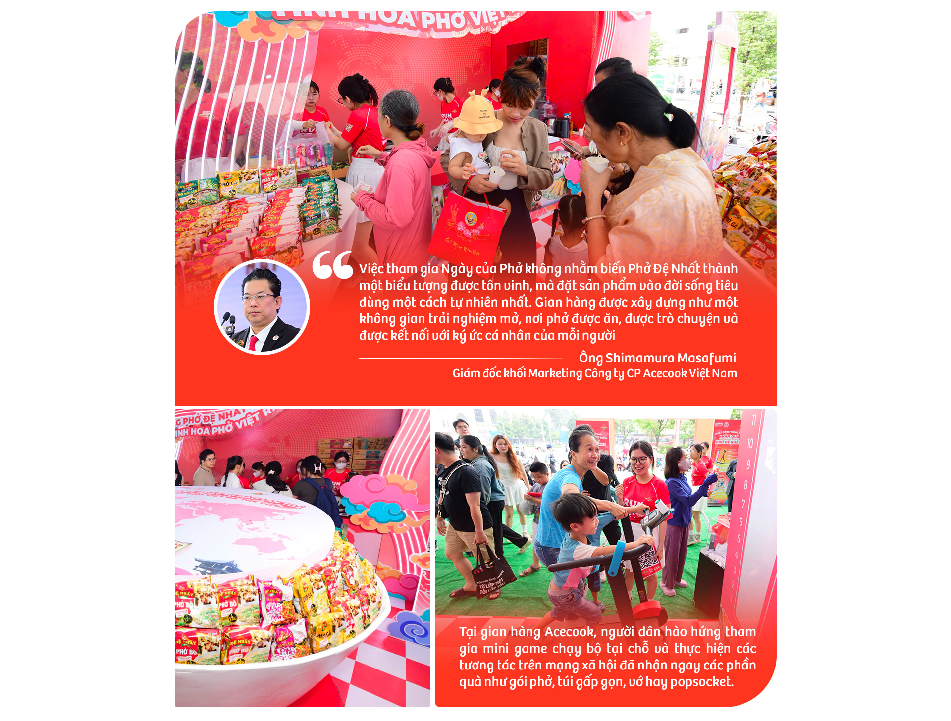 Bên cạnh sản phẩm, Acecook cũng chú trọng cách tiếp cận trẻ trung hơn với phở. Từ năm 2024, thương hiệu phở Đệ Nhất tổ chức giải chạy Run Phở Vietnam, kết hợp ẩm thực với thể thao, hướng đến lối sống năng động, khỏe mạnh của giới trẻ. Tinh thần này tiếp tục được mang đến Ngày của Phở 2025 với hoạt động trải nghiệm máy chạy bộ tại gian hàng, thu hút đông người tham gia ngay từ sáng.
