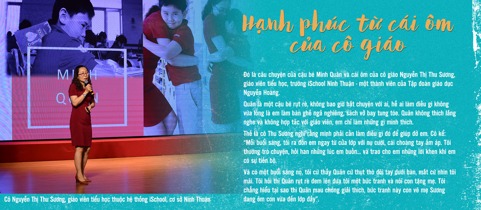"Mặc dù vậy nhưng chưa khi nào tôi thấy em nản lòng, em rất có cố gắng và chăm chỉ. Nhìn em nắn nót, cong người viết từng con chữ, đánh vần từng tiếng, tôi không thôi nghĩ về em. Tìm gặp và trao đổi với phụ huynh, tôi hiểu hơn về hoàn cảnh của gia đình em. 3 tuổi, em vẫn chưa biết nói. Mẹ đã cho em đi gặp rất nhiều chuyên gia và các bác sĩ ngữ âm để can thiệp. Cũng vì vậy mà mẹ đã bỏ hết sự nghiệp của mình, chỉ ở nhà chăm em và theo em đi đến trường mầm non, quan sát em, đọc sách nghiên cứu, theo học các lớp về ngữ âm và trở thành một bác sĩ ngữ âm", cô Tươi nhớ lại học trò mình một năm trước.