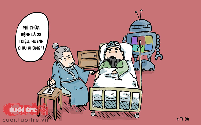 Quan Cong ôm cái đầu đau đớn vào trong phòng khám. Hoa Hồng nhẩn nha: "Mời Quan Cong nằm! Máy mới mua về còn chưa biết giá, chi phí khám chữa bệnh cho huynh ta chưa tính ra được".