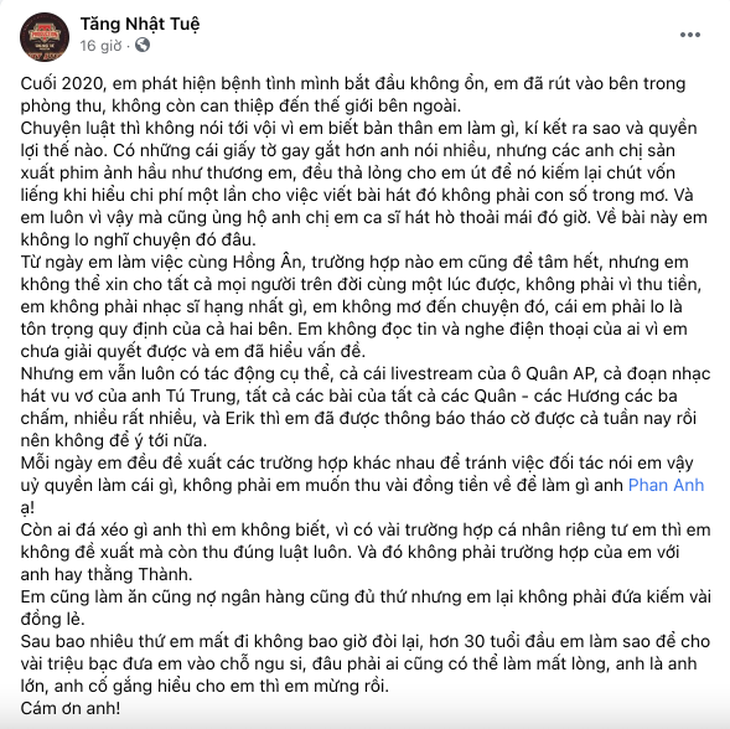 Quản lý Erik tố bị 'ăn chặn' tiền bản quyền, Tăng Nhật Tuệ nói gì?