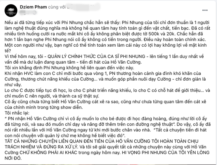 Hồ Văn Cường và mẹ ruột được Trang Trần "mời" lên livestream hỏi chuyện tiền bạc.Theo đó, chiều ngày 10-10, tài khoản Facebook Dziễm Phạm - quản lý của cố ca sĩ Phi Nhung - đã lần đầu chia sẻ về sự việc. Cô một lần nữa bày tỏ tình cảm với ca sĩ Phi Nhung và cho hay cố ca sĩ không bận tâm đến chuyện tiền bạc, cát-sê của con trai nuôi Hồ Văn Cường.