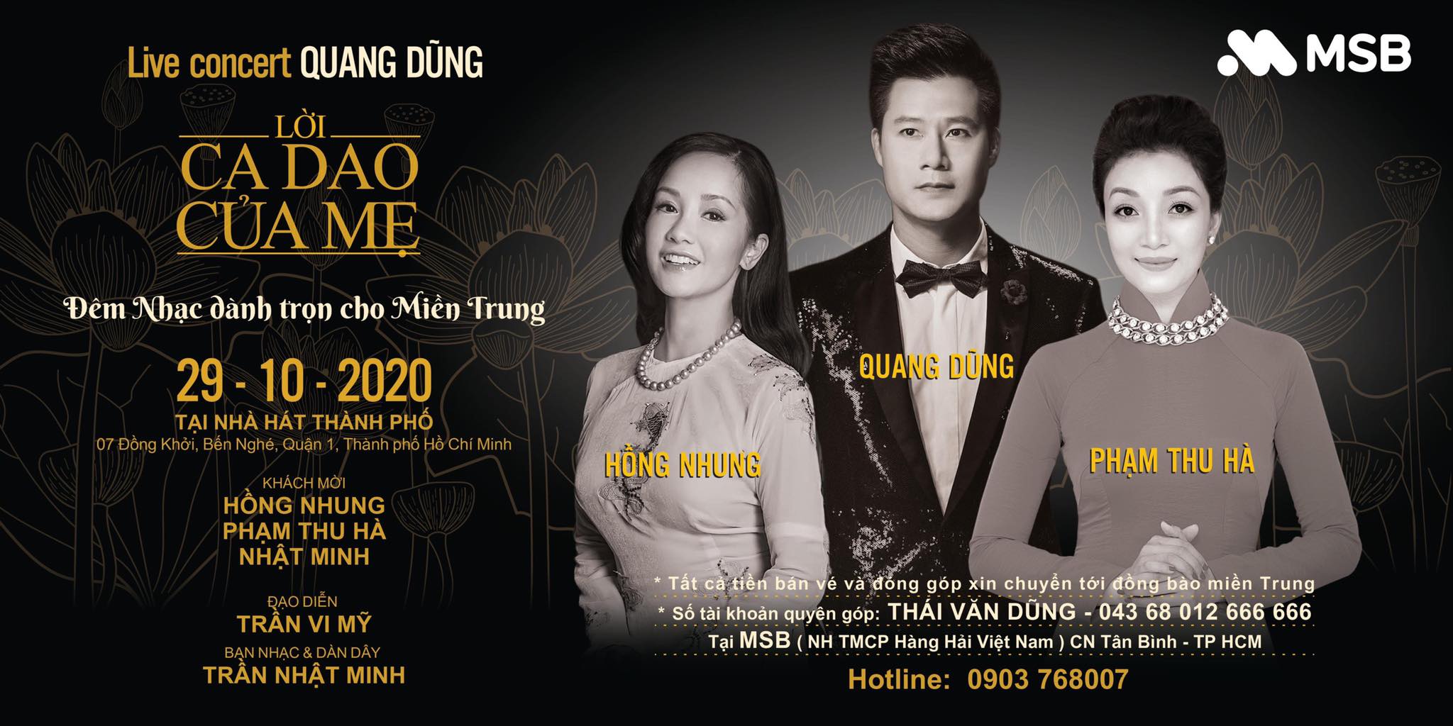 Theo đó, tất cả những nghệ sĩ và ê-kip thực hiện đêm nhạc Lời ca dao của mẹ sẽ không nhận cát-sê. Toàn bộ doanh thu của đêm nhạc sẽ được ca sĩ Quang Dũng và những người bạn tiến hành trao tận tay đến miền Trung ngay sau đêm nhạc kết thúc.