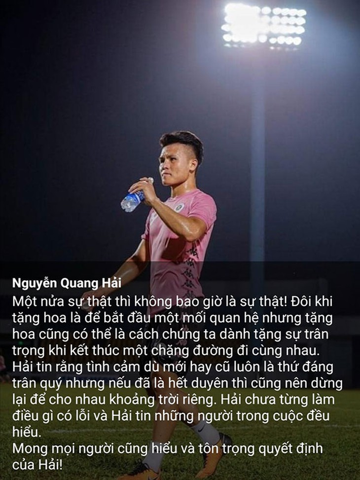 Giải thích trên trang cá nhân, Quang Hải chia sẻ rằng anh chưa từng làm điều gì có lỗi và mong mọi người sẽ hiểu cũng như tôn trọng chuyện tình cảm riêng của anh.