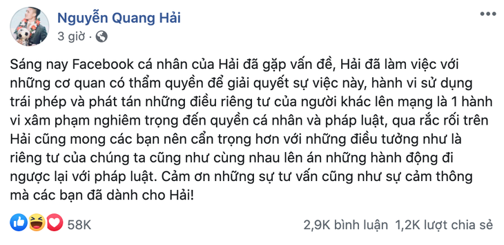 Chiếm quyền kiểm soát tài khoản có tick xanh của Quang Hải, tên hacker đáng ghét liên tục "nhử" netizen bằng những bài post kích thích sự tò mò: "Ai lót dép hóng "phốt" của Quang Hải không nào? Mình vào chơi tí thôi chứ không lấy Facebook luôn đâu. Vẫn có thể lấy lại Facebook bằng số điện thoại hoặc mail nhé idol”.