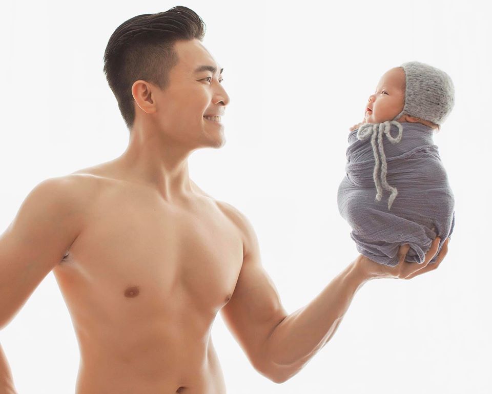 Quốc Cơ nâng bổng con gái 20 ngày tuổi bằng một tay
