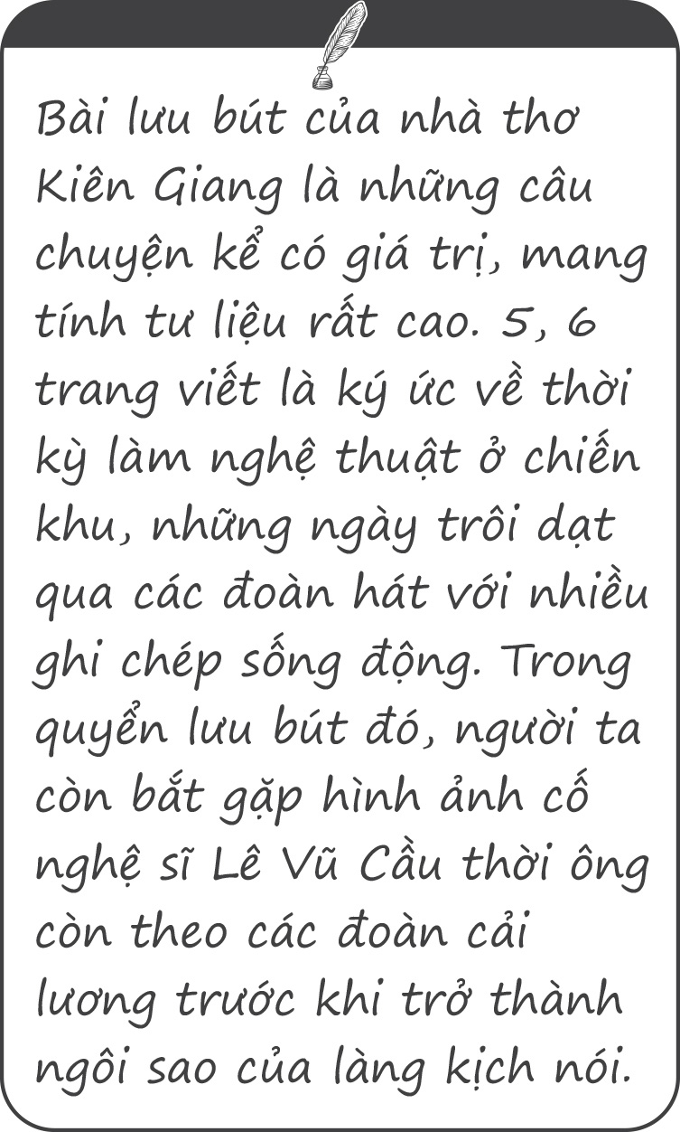 Không chỉ "nhõng nhẽo" với các anh chị nghệ sĩ, quyển lưu bút của Xuân Lan còn gây ấn tượng khi bà có thể "ép" được soạn giả - nhà thơ Kiên Giang viết lưu bút cho bà.