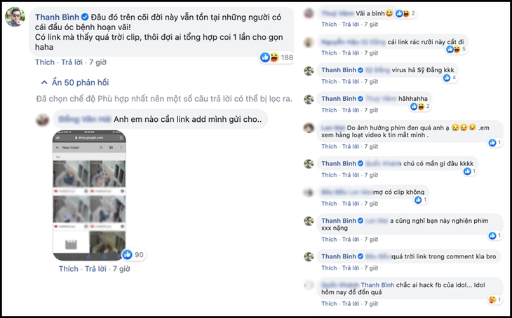 Phía dưới bài đăng của "hiệp sĩ", hàng ngàn cư dân mạng đã tạo nên một cuộc bình luận tưng bừng. Điều đáng nói là có rất nhiều người "nhảy vào" chỉ để... hóng link, xin clip, bất chấp đây là những cảnh quay hết sức nhạy cảm. Thậm chí, nam diễn viên Thanh Bình cũng không đứng ngoài cuộc khi để lại một bình luận...kỳ lạ, khiến nhiều người chưng hửng :"Đâu đó trên cõi đời này vẫn tồn tại những người có cái đầu óc bệnh hoạn vãi! Có link mà thấy quá trời clip, thôi đợi ai tổng hợp coi 1 lần cho gọn haha"!